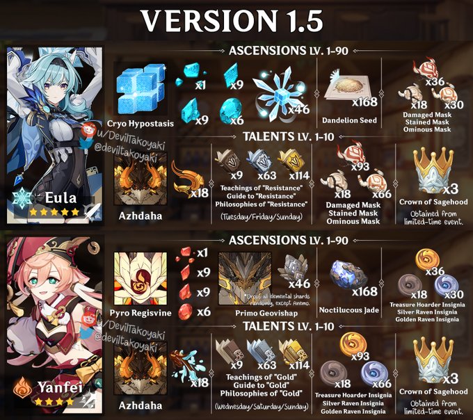엠버, 타르탈리아, 디오나, 설탕, 클레, 바바라, 각청, 치치, 소, 응광, 노엘, 다이루크, 레이저, 베넷, 진, 모나, 중운, 감우, 향릉, 호두, 케이아, 알베도, 피슬, 벤티, 리사, 북두, 신염, 행추, 종려, 여행자, 로자리아, 유라, 연비, 아야카, 요이미야, 사유, 카즈하, 아야카, 요이미야, 사유, 에일로이, 라이덴쇼군, 쿠죠사라, 코코미