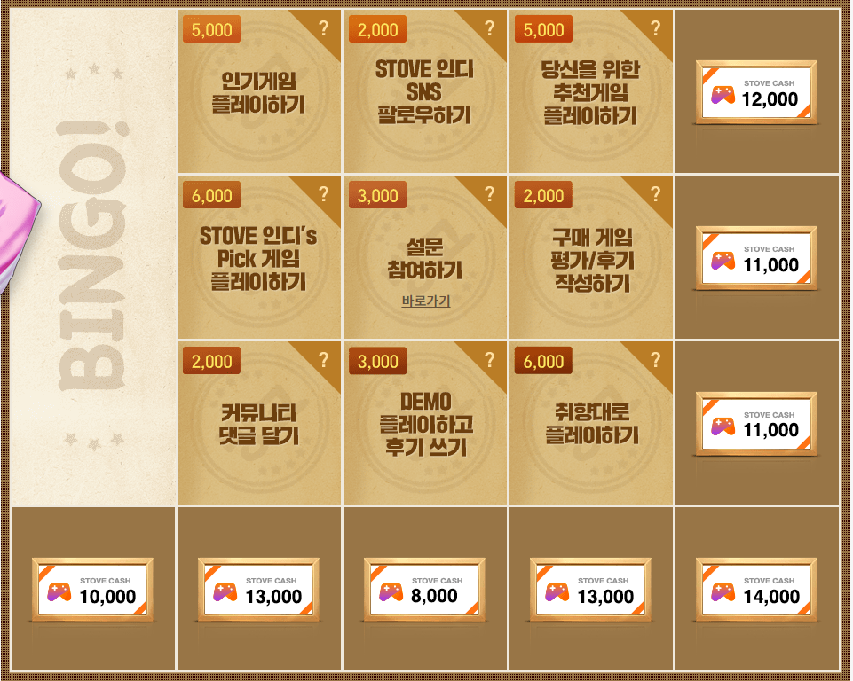스토브에서 인디게임을 밀어주는 건지 대박 이벤트를 진행한다. 게임 플레이하고 후기 남기고, 댓글달고 등등 여러가지 활동을하면 스토브 캐쉬를 지급한다. 스토브는 다들 알다시피 로아 캐시로도 쓸 수 있다.