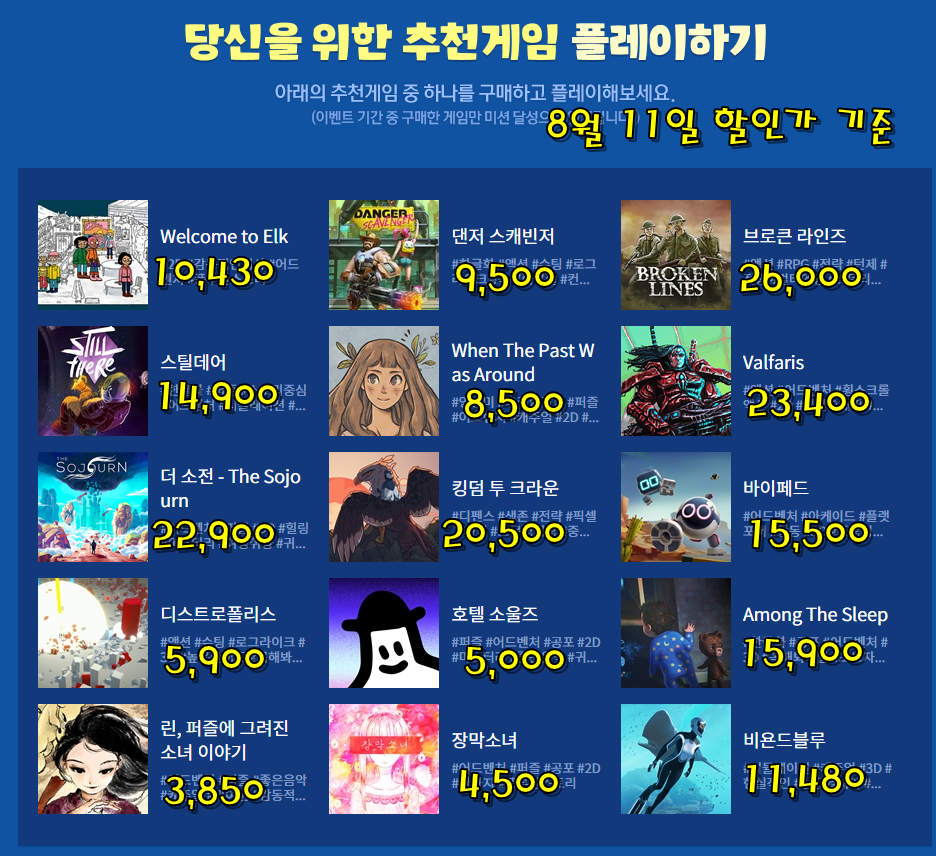총 4개에서 게임을 직접 구매하고 92,000 캐쉬를 받는다. 날마다 할인되는 가격이 다르니 최대한 싼 가격의 게임을 골라서 구매하자. 투자금액이 작을수록 돌아오는 캐쉬가 많다고 생각하면 된다. 8월 11일 기준으로 작성한 글이니 할인가를 직접 확인하고 게임을 구매하자. 로아 캐쉬를 더 많이 얻고 싶으면 지금이 기회다. 소서리스도 나왔는데 전각도 사고 골드도 사야하지 않겠나?
