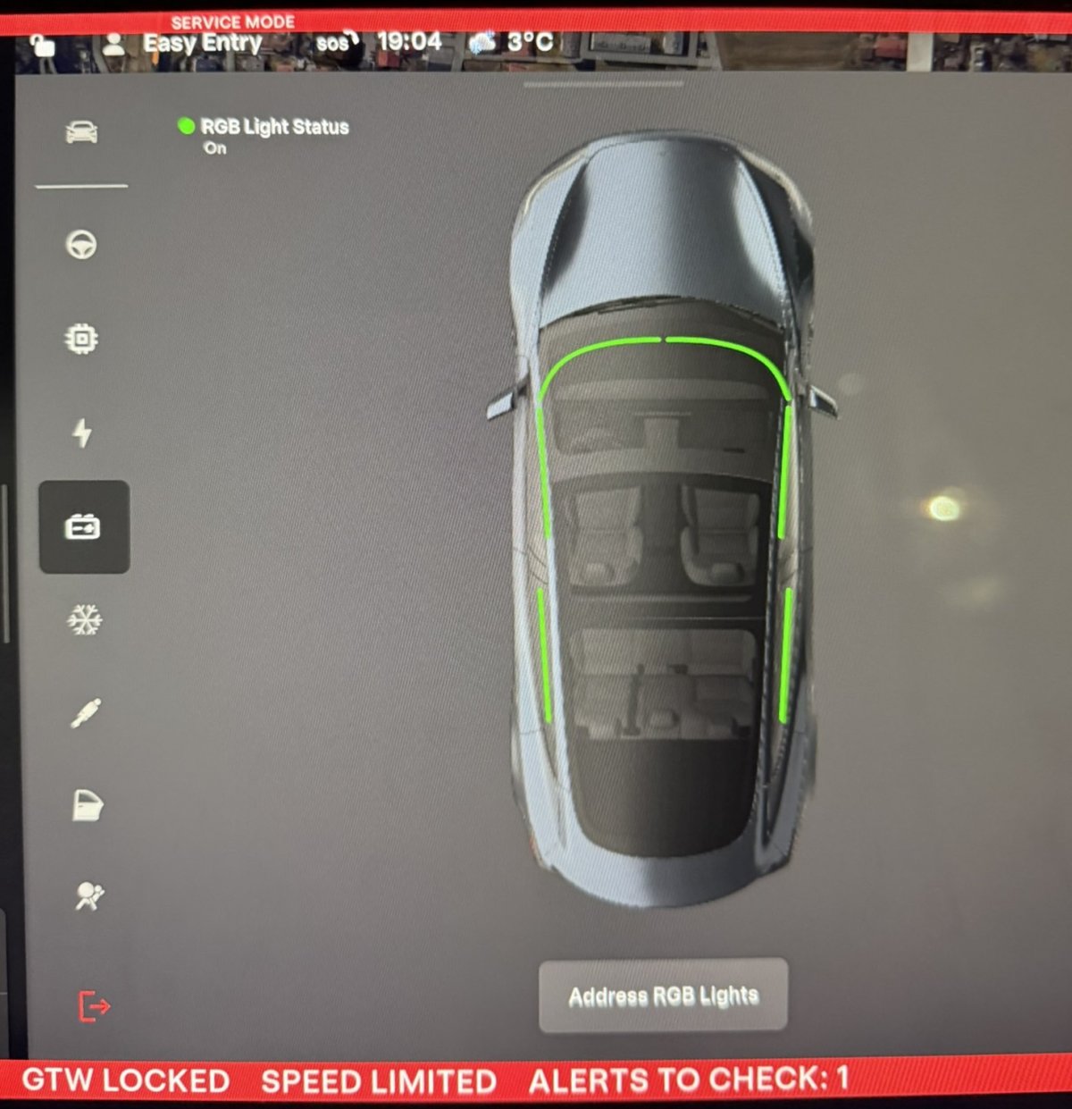 - 서비스 모드에 추가된 마지막 기능은 새로운 Model 3과 Cybertruck의 주변 조명 시스템을 테스트하는 패널. 이 패널을 통해 차량의 RGB 조명을 진단하고 수리할 수 있으며, 조명의 상태를 확인하고 필요한 경우 RGB 조명 주소 지정 루틴을 실행할 수 있다.