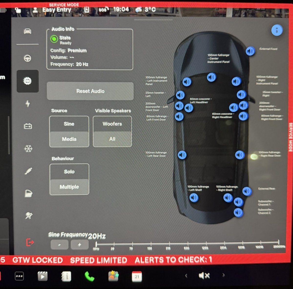 오디오 테스트 과정에서 특정 주파수를 재생하여 스피커의 정확한 문제를 파악할 수 있다. 과거에는 TB3를 통해서만 이러한 테스트가 가능했지만, 현재 테슬라는 서비스 모드를 개선하여 차량 소유자와 외부 기술자의 접근성을 높였다.