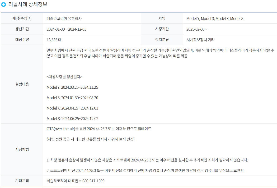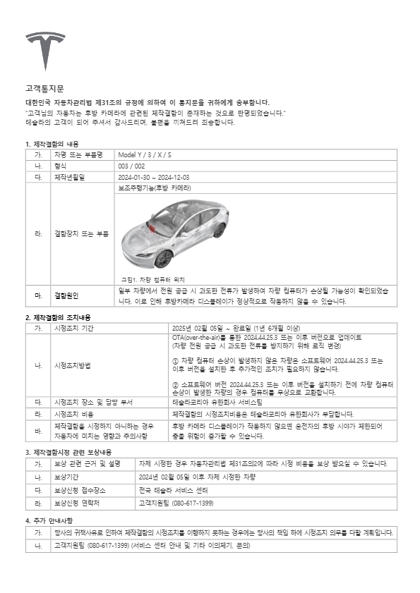 후방 카메라 관련 테슬라 리콜 통지가 올라왔습니다. 전원 공급 시 과도한 전류 발생으로 컴퓨터 손상, 후방카메라 디스플레이가 작동하지 않을 수 있다는 내용입니다. 저도 실제로 후방카메라 디스플레이가 작동하지않아 트렁크쪽 흠집이 잡혔는데 이제 리콜을 해주네요.