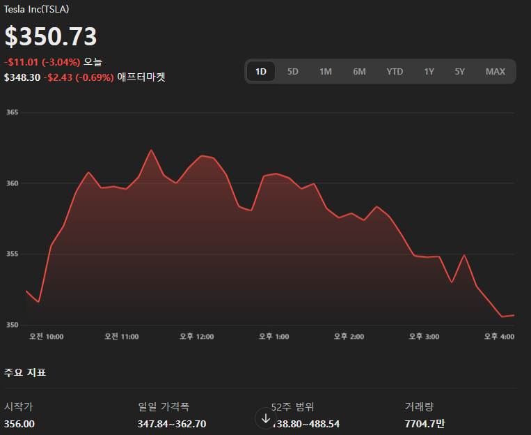 - 요약: 테슬라 주가는 로보택시 서비스 출시 계획 발표 이후 상승세를 보이며, 2024년 12월 최고점인 488.54달러에서 18% 하락한 후에도 전년 대비 110% 상승한 상태를 유지하고 있습니다.