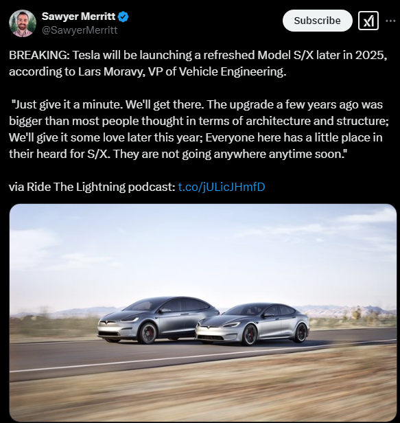 2025년 2월 24일 기준으로, 테슬라의 차량 엔지니어링 부사장인 라스 모라비(Lars Moravy)가 2025년 후반에 신형 모델 S와 모델 X를 출시할 계획이라고 밝혔다는 소식이 X를 통해 전해졌습니다. 그는 "몇 년 전 업그레이드가 구조적으로 큰 변화였다면, 이번에는 더 많은 사랑을 담아 개선할 것"이라는 뉘앙스의 발언을 한 것으로 보입니다. 이는 모델 X가 완전히 새롭게 설계된다기보다는 기존 모델을 기반으로 한 리프레시(업데이트) 버전이 될 가능성을 시사합니다.