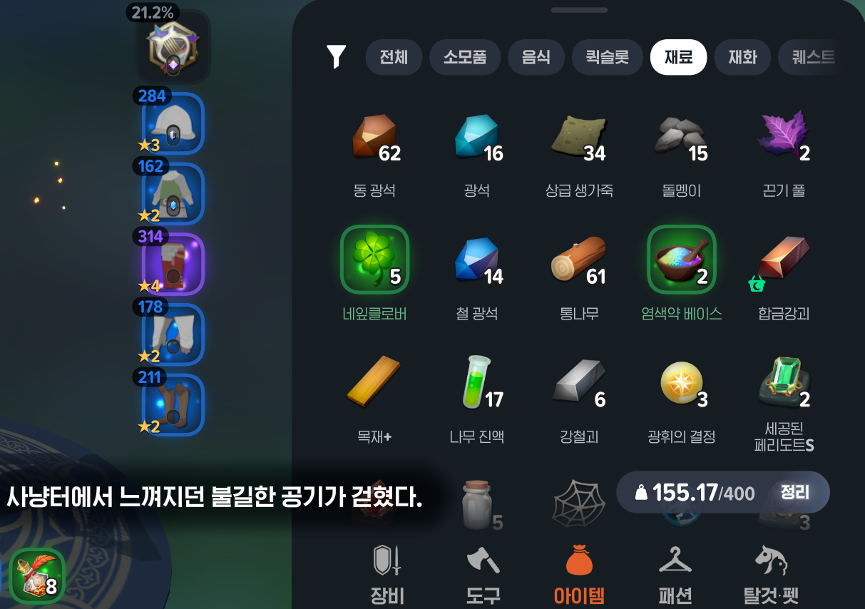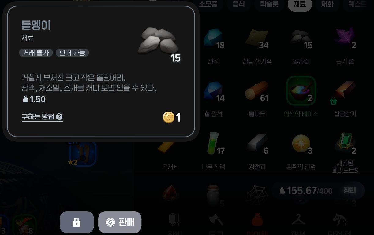1. 메뉴 - 가방 - 아이템으로 들어간 다음 [재료]를 선택한다.