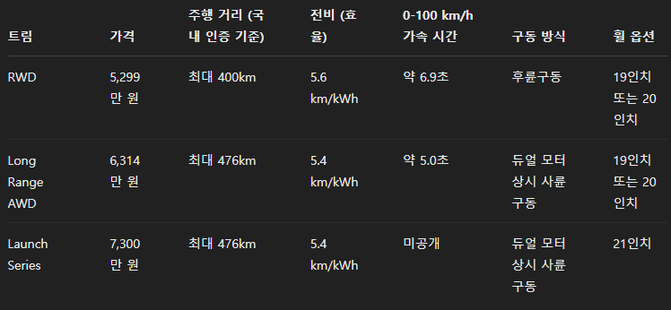- 구동 방식: 듀얼 모터 상시 사륜구동