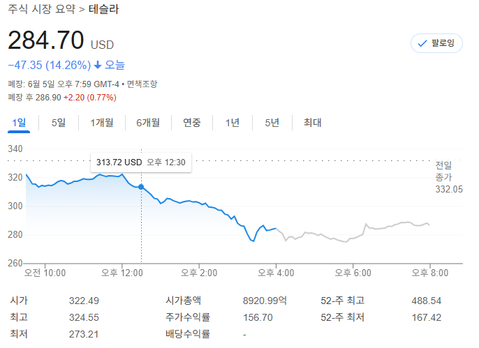 테슬라 주가 역대급 하락 284.70 (-14.26%)