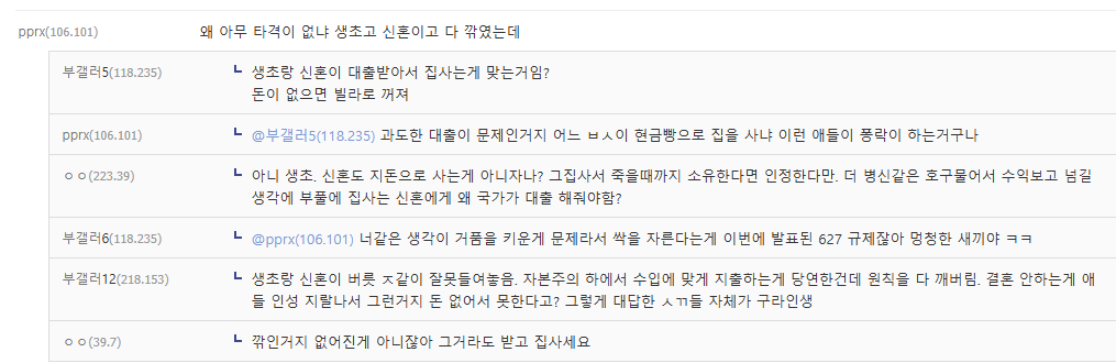 생애 최초, 신혼 부부가 타격이라는 의견도 있지만, 무리해서 신혼부부가 왜 풀대출하며 무리하게 집을 사는건가요? 그건 투기입니다. 현금 자산에 맞게, 자기 분수에 맞게 집을 사는게 맞습니다. 해당 pprx는 영끌이 혹은 갭투자가 코스프레하는겁니다. 전혀 공감되지 않는 의견이죠.